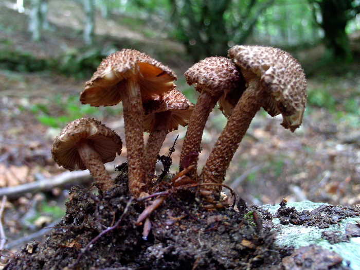 Pie de 5-6 x 0,5-0,7 cms, provisto en el tercio superior, de anillo ascendente, membranoso, de color pardo negruzco. Parte superior blanca, que exuda a menudo gotitas pardas.